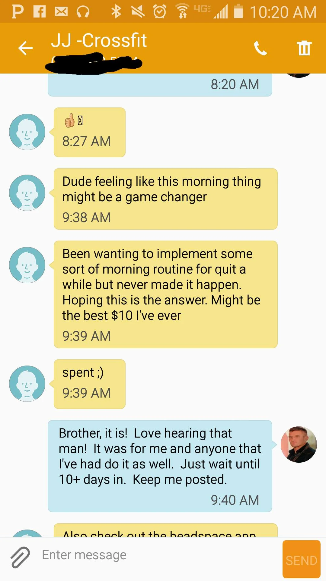 Here is a text that I received one day after JJ implemented the Kingsman Morning routine.